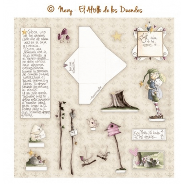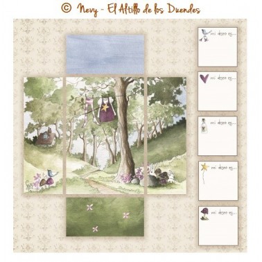 Colección compuesta por 3 papeles decorados por una cara para realizar una caja de los deseos de la hada Nora. Puedes descargarte la plantilla (no incluida ) con medidas para realizar la caja si se desea seguir las instrucciones de la diseñadora.