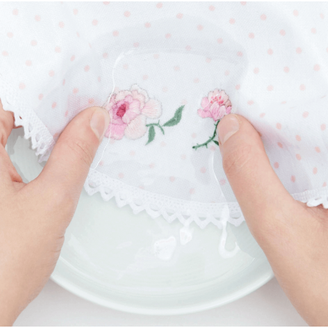 - Cuando hayas terminado de bordar, sumerge la pieza en agua tibia. La pegatina se disolverá y no quedará ningún rastro.