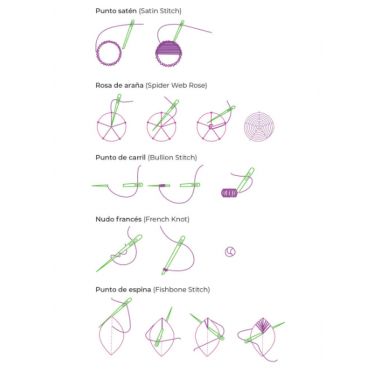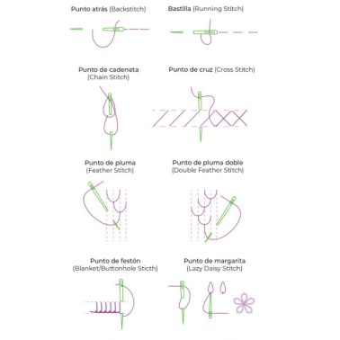 Con la Regla Crazy podrás hacer: Punto atrás, Bastila, Punto de cadeneta, Punto de cruz, Punto de pluma, Punto de pluma doble, Punto de festón, Punto de margarita, Punto de satén, Rosa de araña, Punto de carril, Nudo francés y Punto de espina.